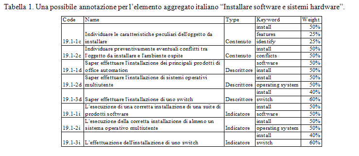 La Tabella 1 mostra una porzione dei metadati e delle parole chiave collegate ad alcuni elementi di basso livello del modello italiano. A titolo di esempio, la competenza "Individuare le caratteristiche peculiari dell'oggetto da installare", che è di tipo Contenuto, può essere caratterizzata da tre keywords: install (con peso 50%), features (con peso 25%) e identify (con peso 25%). E' importante sottolineare che in un contesto reale, in cui si analizza un preciso scenario di riferimento, i pesi devono essere assegnati dagli esperti in base al significato di uno specifico elemento. Un estratto di una possibile annotazione per la qualifica francese è mostrato nella Tabella 2. In questo caso gli elementi della qualifica sono descritti in base a tre metadati: Compétence professionnelle, Critère d'évaluation, e Niveaux de performance. Le relazioni tra gli elementi del modello italiano e di quello francese sono mostrate in Figura 1.