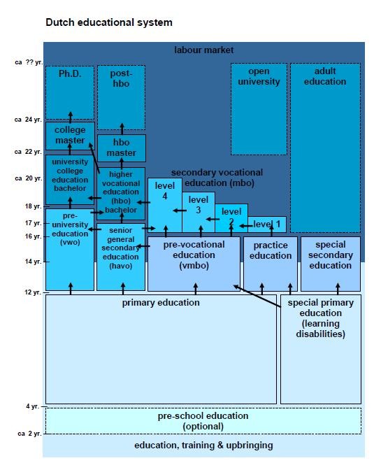 At the age of 12, most students leave primary education and continue their school career in secondary education. The secondary education consists of three different school types: pre-university education (vwo), senior general secondary education (havo) and pre-vocational education. The vocational training is divided into pre-vocational, vocational and higher vocational. In the Netherlands the secondary vocational education will undergo a considerable change in the next few years. This change is necessary in order to accommodate the wishes of business and education sectors and to keep up with current developments in society. Central to the innovation is the idea of competence. Currently all courses refer to a qualification linked to a specific profession.